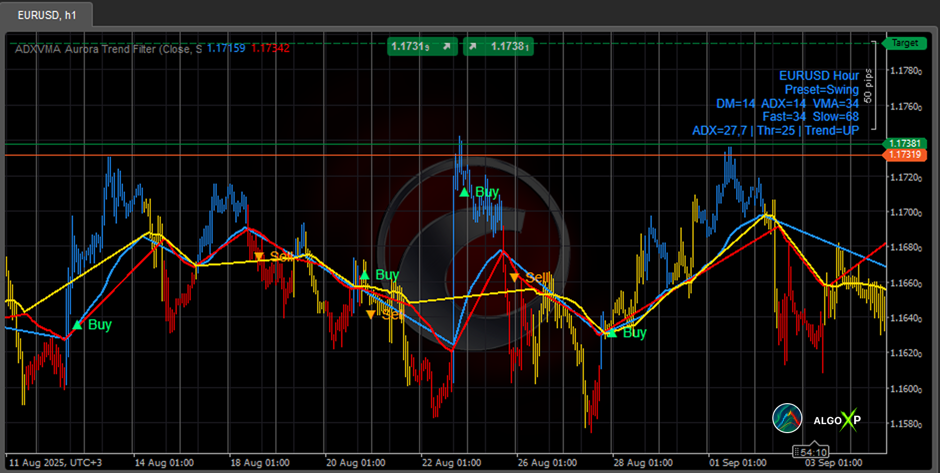 - Stop = Aurora line −/+ buffer (e.g., 8–15 pips on majors; adapt to symbol/TF).