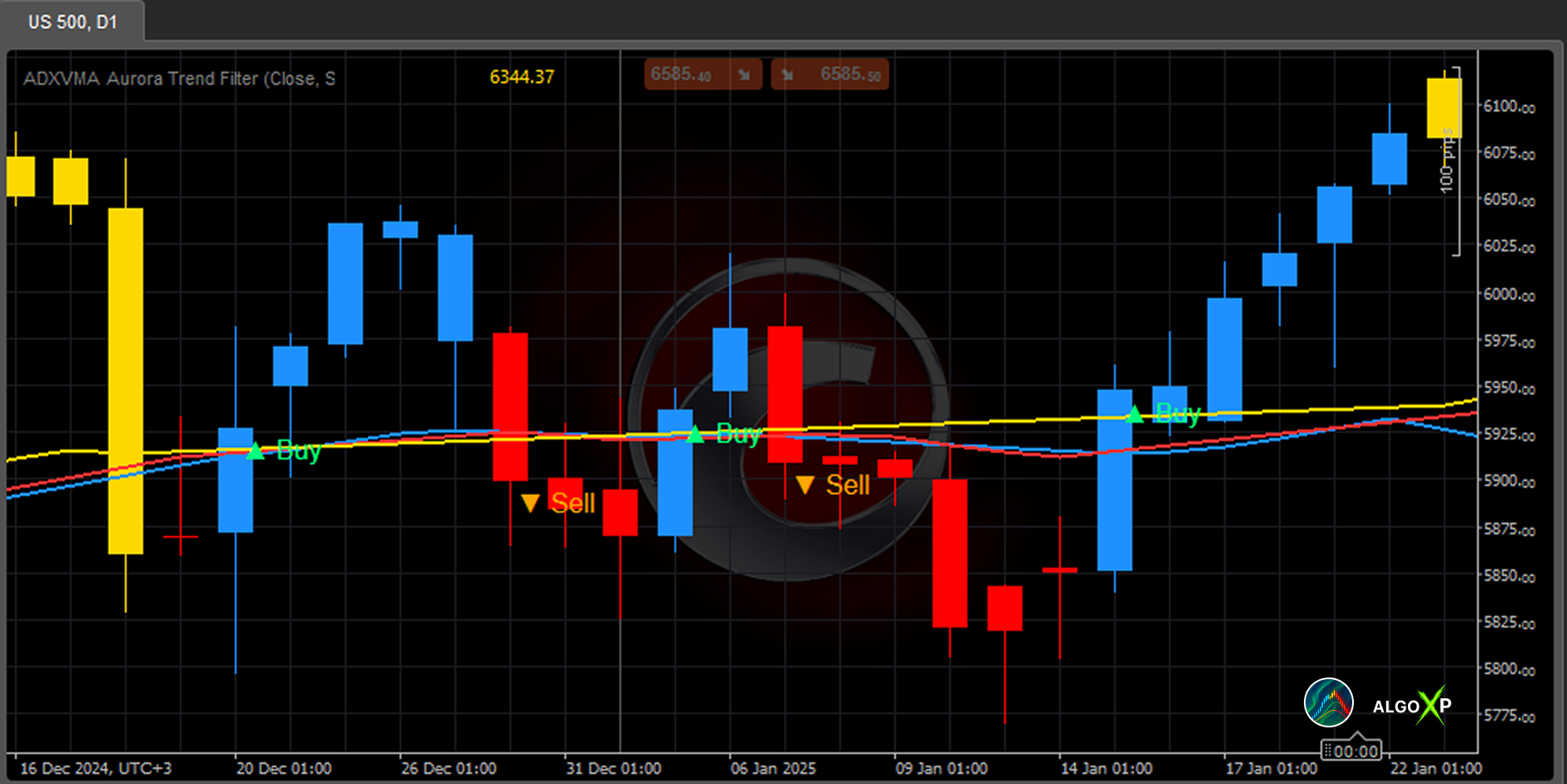 Exit: Stop at Aurora ± buffer; take profits at RR≥2 or on opposite cross / color flip