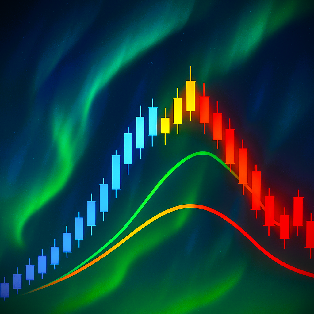 ADX (0…100) measures trend strength. Aurora blends a fast and a slow EMA, using ADX as the weight: