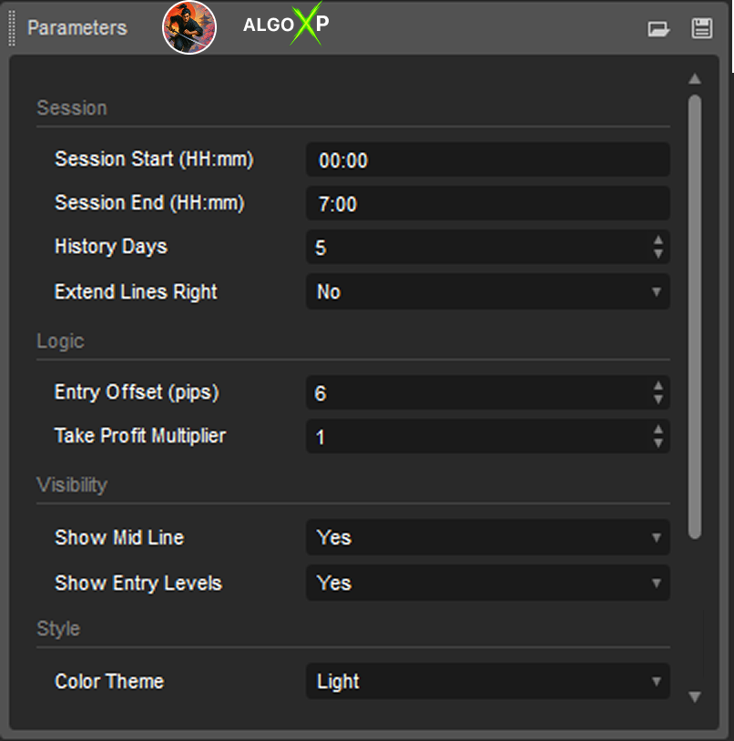 - Off: only the session box is displayed, for traders who want to analyze range without execution levels.