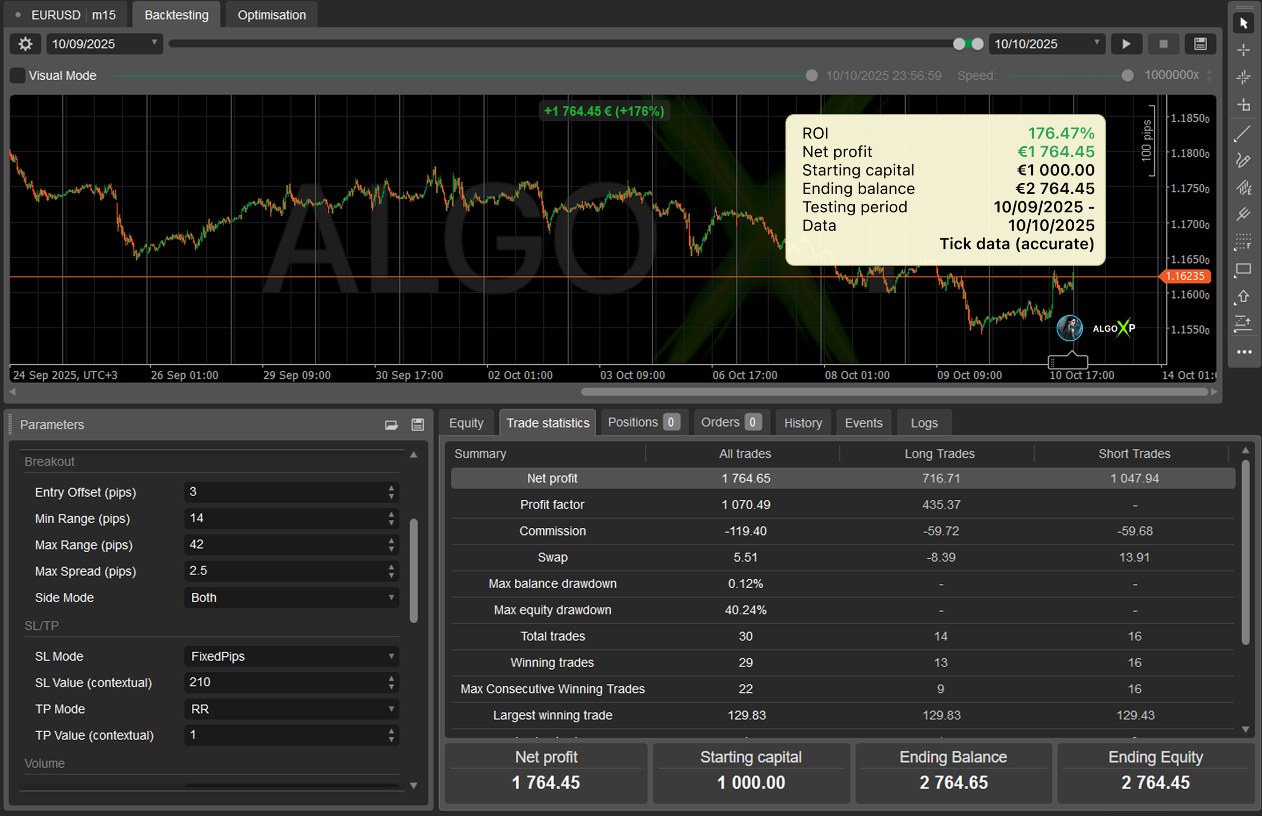 - Breakout: entry offset, min/max range, max spread, allowed side (Both/Buy only/Sell only).