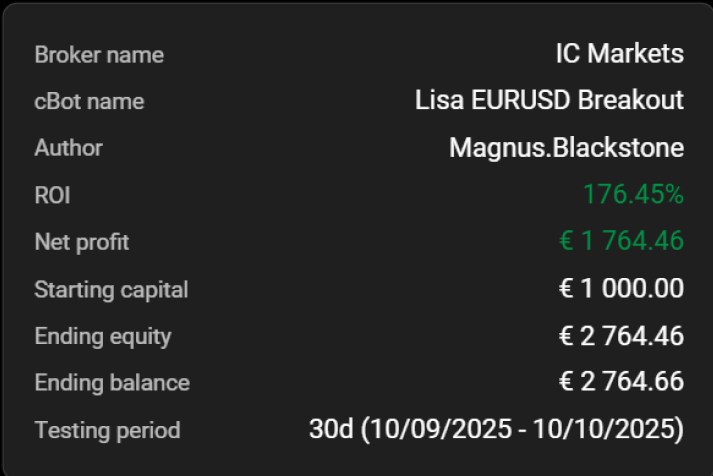 Lisa EURUSD Breakout is a purpose-built cTrader robot for EURUSD that trades a classic session box breakout with disciplined risk controls.