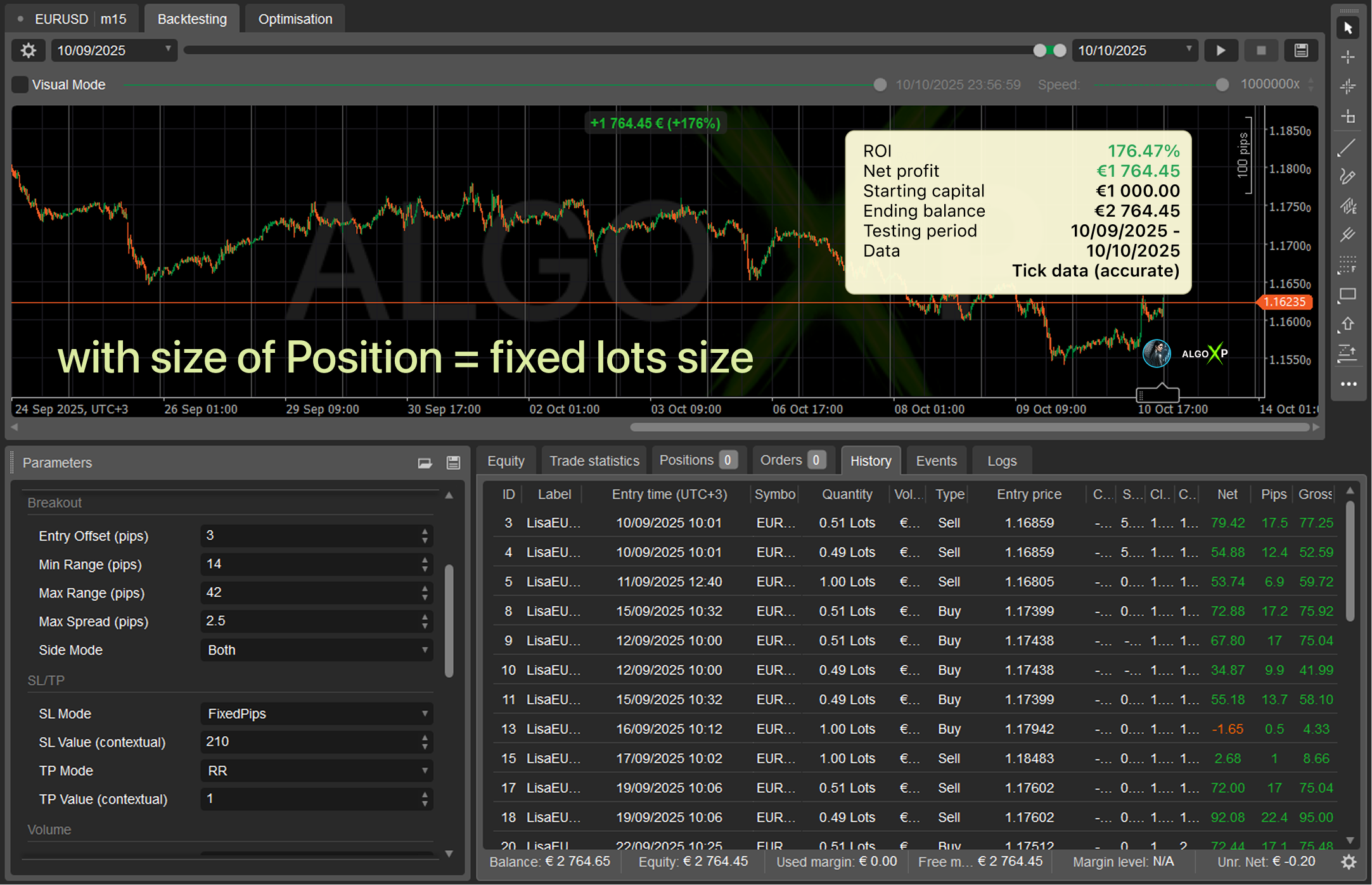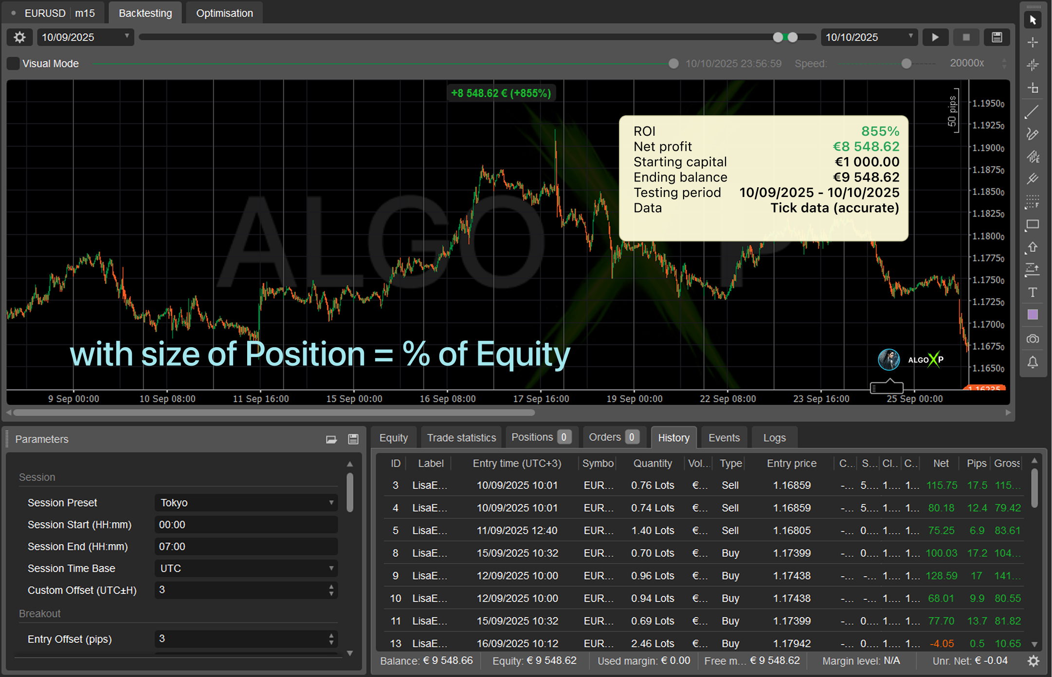 Lisa EURUSD Breakout is ideal for traders who want a transparent, session-driven breakout system with simple SL/TP logic and sensible guardrails – without grids or martingale.