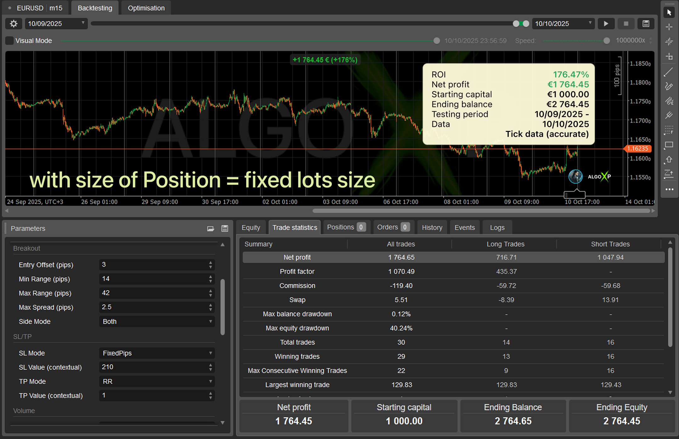So the expected position size is around €100 / (€225–€250) ≈ 0.40–0.45 lots, which is roughly 40,000–45,000 units (exact value may vary slightly due to contract specs and volume-step rounding). - With SL Mode = FixedPips, SL distance is